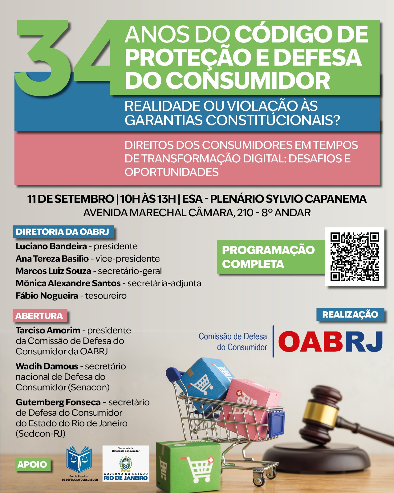 Também vão participar da mesa de abertura, o Diretor Tesoureiro da OAB-RJ, Fabio Nogueira, o secretário – geral da ESA, João Quinelato, o presidente da comissão de Defesa do Consumidor, Tarciso Amorim, o Secretário Nacional de Defesa do Consumidor, Wadih Damous, o secretário de Defesa do Consumidor do estado do Rio de Janeiro, Gutemberg Fonseca, entre outros.