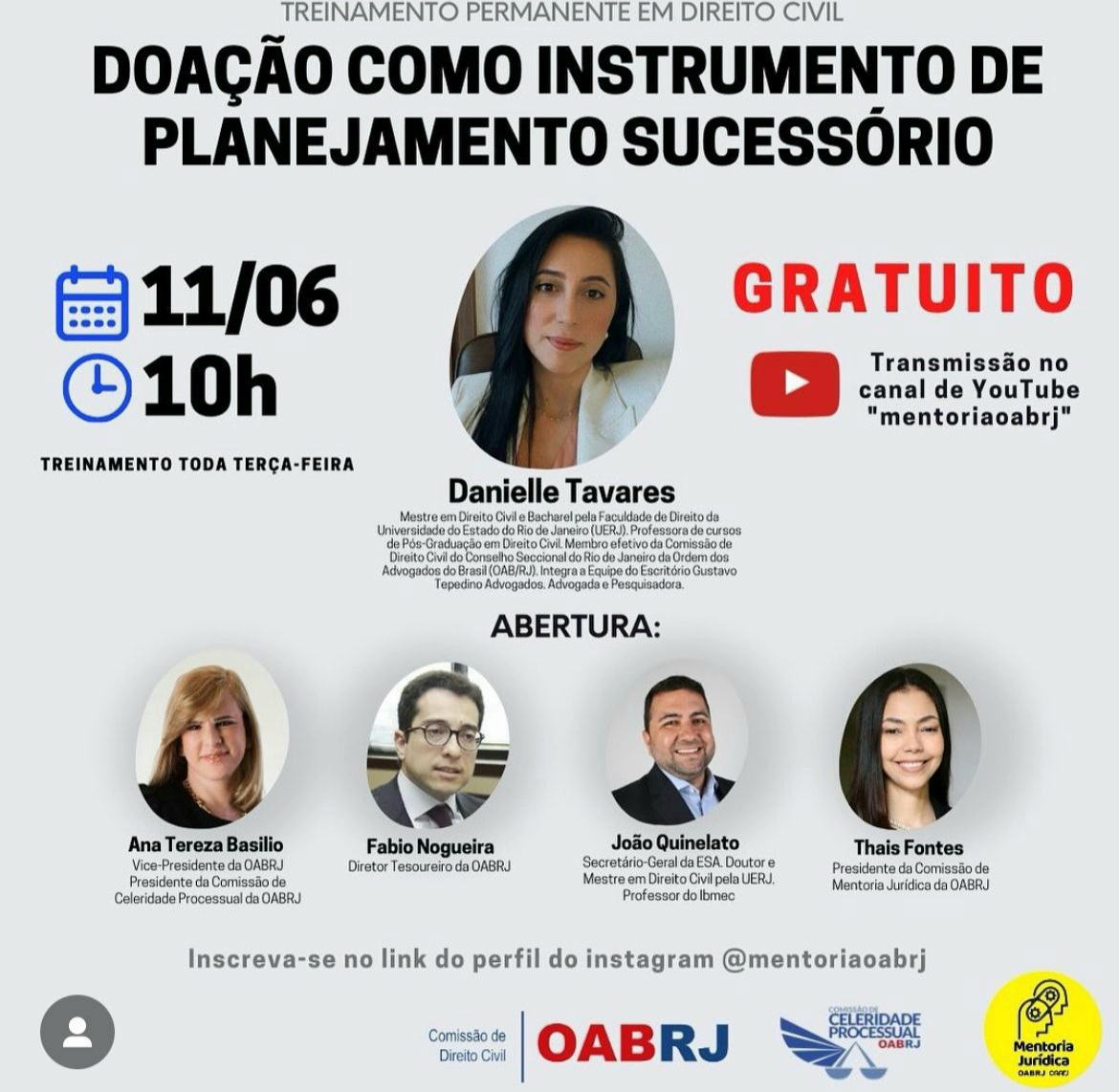 Também estarão no encontro virtual, o diretor tesoureiro da OAB-RJ, Fabio Nogueira, secretário-geral da ESA, João Quinelato, a presidente da comissão de Mentoria Jurídica, Thaís Fontes, e a advogada Danielle Tavares.
