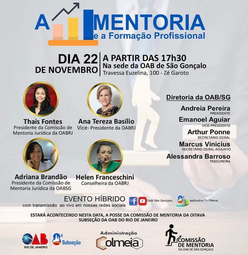 Também estarão presentes ao encontro, a presidente da comissão de Mentoria Jurídica da OAB-RJ, Thais Fontes, Adriana Brandão, presidente da comissão de Mentoria Jurídica da OAB de São Gonçalo, e Helen Franceschini, conselheira da OAB-RJ.
