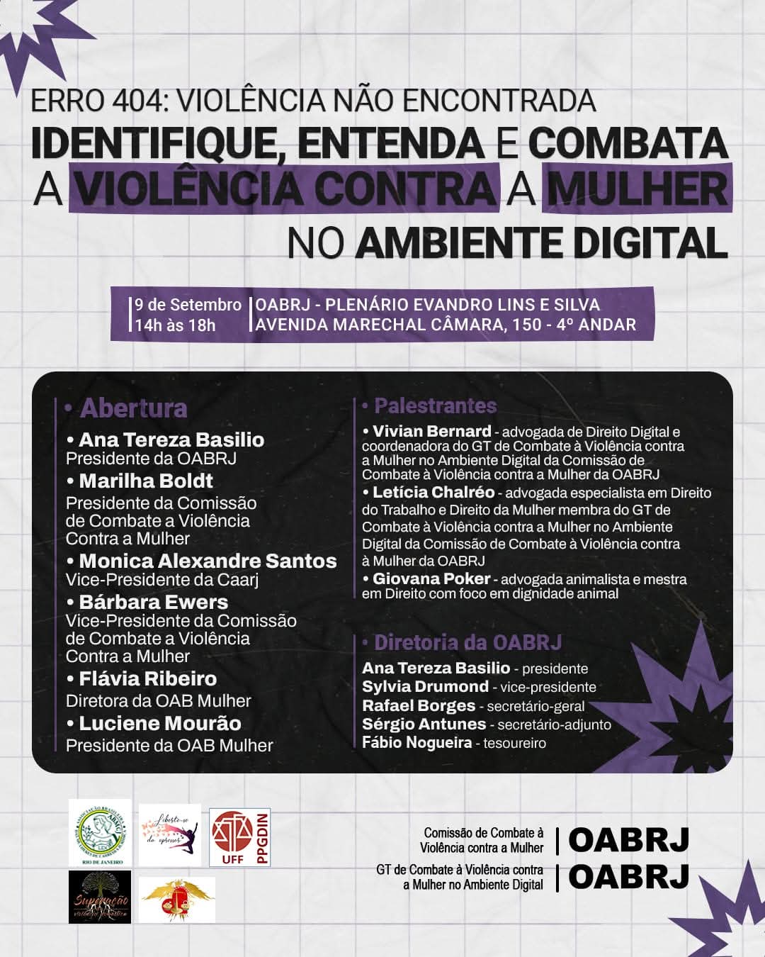 Também estarão no evento,  a presidente da comissão de Combate à Violência Contra a Mulher, Marilha Boldt, a vice-presidente da comissão, Bárbara Ewers, a vice-presidente da Caarj, Mônica Alexandre,  a Diretora da OAB Mulher, Flavia Ribeiro, a presidente da OAB Mulher,  Luciene Mourão,  entre outros convidados.