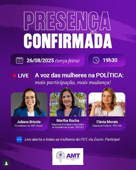 A Secretária de Assistência Social do Município do Rio de Janeiro, deputada Martha Rocha, participa, nesta terça-feira, dia 26 de agosto, às 19h30, pelo zoom do PDT, da Live ” A voz das mulheres na política “, com a participação de Juliana Brizola ( neta de Leonel Brizola) e da deputada federal pelo PDT de Goiás, Flavia Morais.