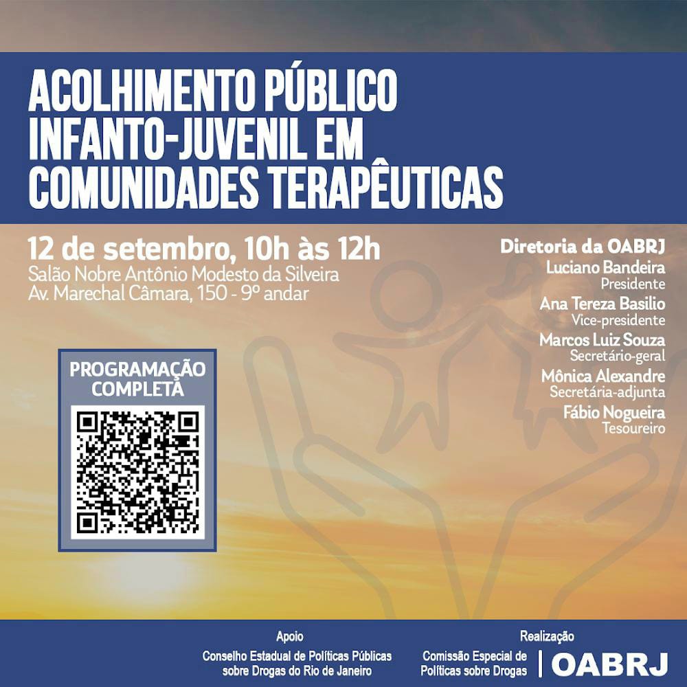 nesta quinta-feira, dia 12 de setembro,às 10h, a palestra de abertura do Seminário ” Acolhimento público infanto-juvenil em comunidades terapêuticas “. O evento é gratuito e é promovido pela comissão Especial de Políticas sobre Drogas da seccional e pelo Conselho Estadual de Políticas Públicas sobre Drogas, do Rio de Janeiro.