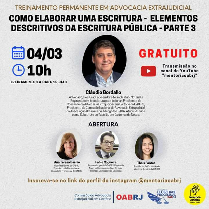 Também estarão no encontro virtual, o presidente da comissão nacional de Advocacia Extrajudicial em Cartório da OAB-RJ, Cláudio Bordallo, o procurador-geral da seccional, Fábio Nogueira, e a presidente da comissão de Mentoria Jurídica, Thais Fontes.