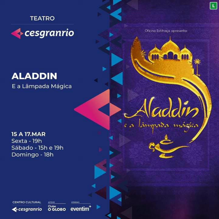 Criado por Carlos Alberto Serpa, o Teatro Cesgranrio vai apresentar, a partir desta sexta-feira, dia 15, às 19h, o espetáculo “Alladin e a lâmpada mágica”, que ficará em cartaz até o dia 17 de março (domingo será às 18h) .