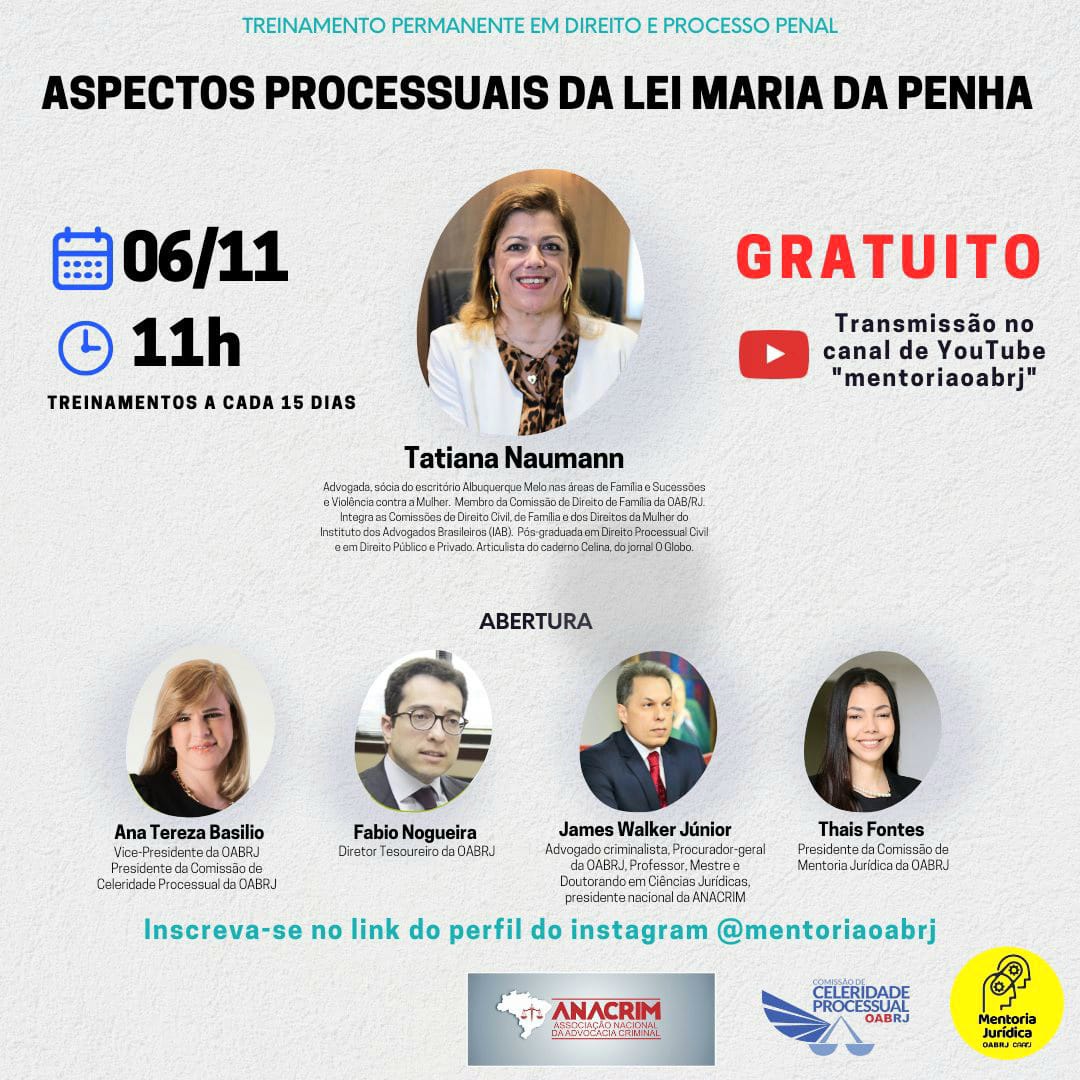 Também estarão no evento virtual, o Diretor Tesoureiro da OAB-RJ, Fabio Nogueira, a presidente da comissão de Mentoria Jurídica, Thais Fontes, o procurador-geral da OAB-RJ, James Walker Junior, e a advogada Tatiana Naumann.