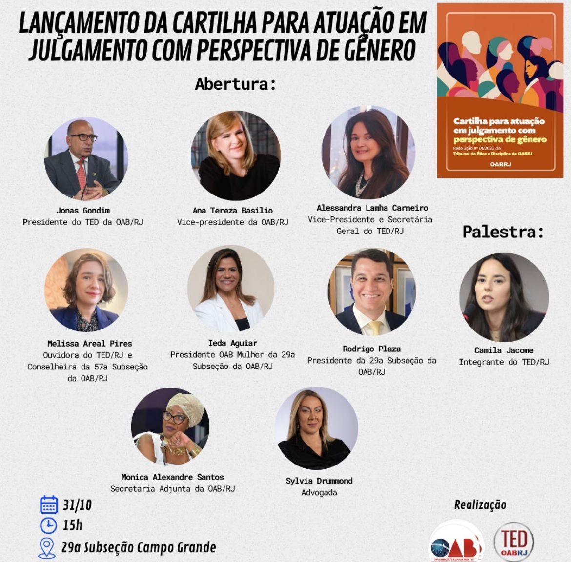 Também estarão no encontro presencial, o presidente do TED da OAB-RJ, Jonas do Espírito Santo, as advogadas Sylvia Drummond, Camila Jacome, Ieda Aguiar, Mônica Alexandre, Melissa Pires, Alessandra Lamha e pelos
