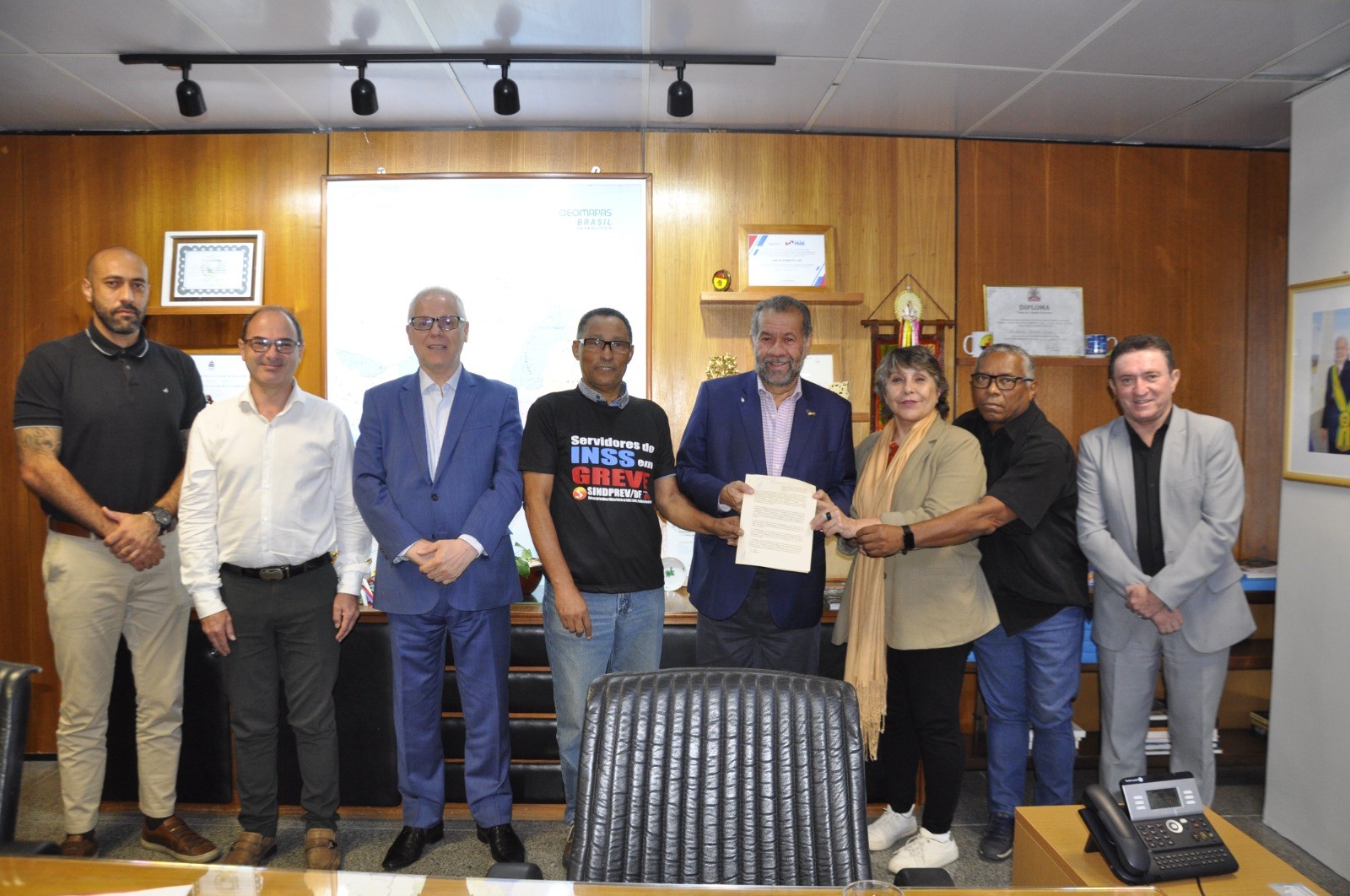 O ministro da Previdência Social,  Carlos Lupi,  e o presidente do INSS,  Alessandro Stefanutto,  receberam,  em audiência,  em Brasília,  o deputado federal Glauber Braga (PSOL-RJ), e representantes da Federação Nacional de Sindicatos de Trabalhadores em Saúde,  Trabalho,  Previdência e Assistência Social (Fenasps) .