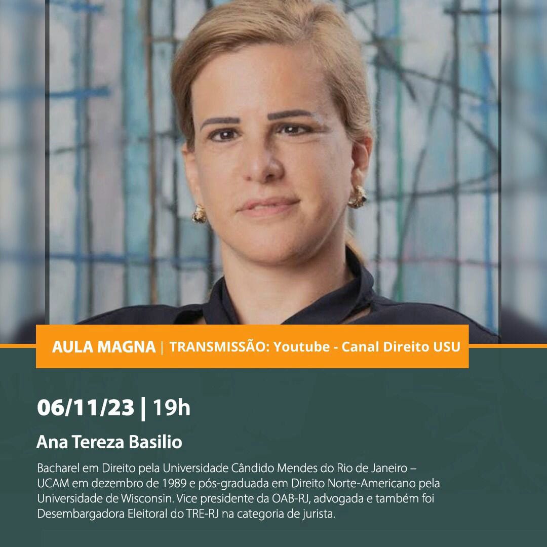 Vice-presidente da OAB-RJ e presidente da comissão de celeridade processual, Ana Tereza Basilio vai ministrar, nesta segunda-feira, dia 6, às 19h, pelo YouTube Canal Direito USU, a Aula Magna da Semana Jurídica da Universidade Santa Úrsula, promovida pelo reitor, professor Paulo Alonso.
