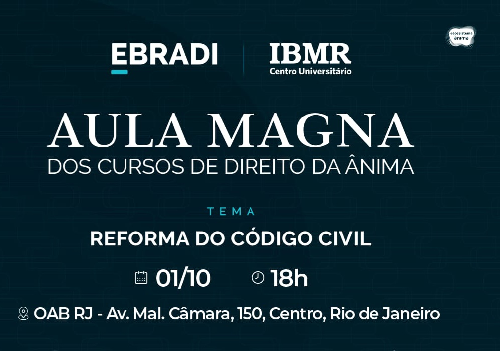 Vice-presidente da OAB-RJ e presidente da comissão de celeridade processual, Ana Tereza Basílio vai proferir a palestra de abertura, nesta terça-feira, primeiro de outubro, às 18h, no auditório da seccional do Rio, do evento “Aula Magna dos Cursos de Direito da ANIMA”, com o tema ” Reforma do Código Civil” . O encontro é promovido pelo Centro Universitário- IBMR (Instituto Brasileiro de Medicina Reabilitação) do Rio de Janeiro, e pela EBRADI (Escola Brasileira de Direito).
