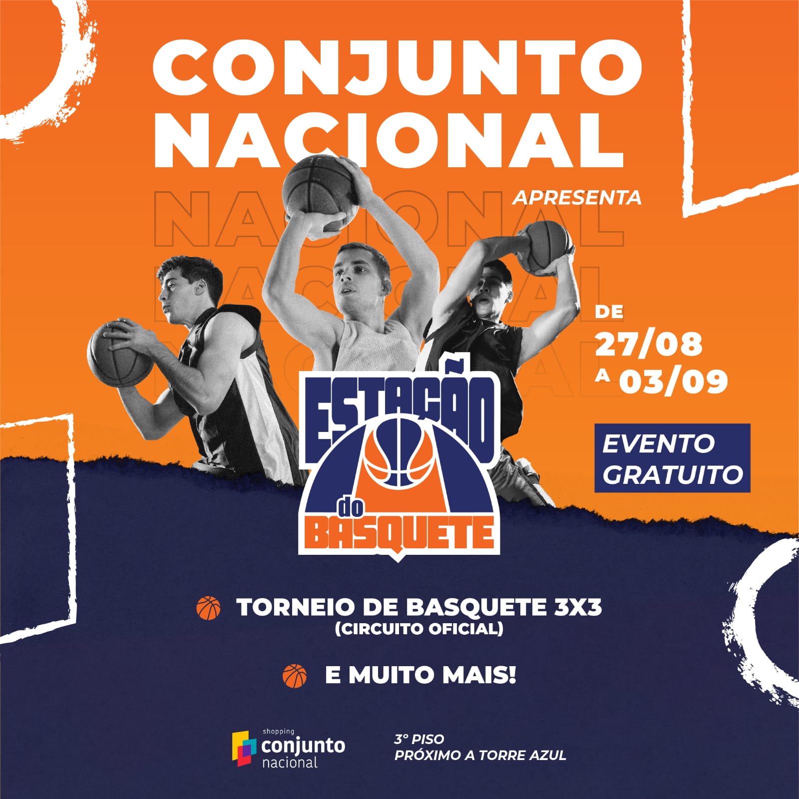 Já conhecida por sua vocação para os eventos culturais e gastronômicos, a área ao ar livre do 3º piso do Conjunto Nacional abre espaço para a estreia de sua programação esportiva. O Esporte em Conjunto acontece de 27 de agosto a 03 de setembro na área descoberta do P3, próxima à Torre Azul, e contará com várias atividades que promovem a prática esportiva do basquete. Desafios de 3X3, 1X1, arremessos livres, shows acrobáticos são alguns dos destaques do evento, que terá acesso livre e gratuito.