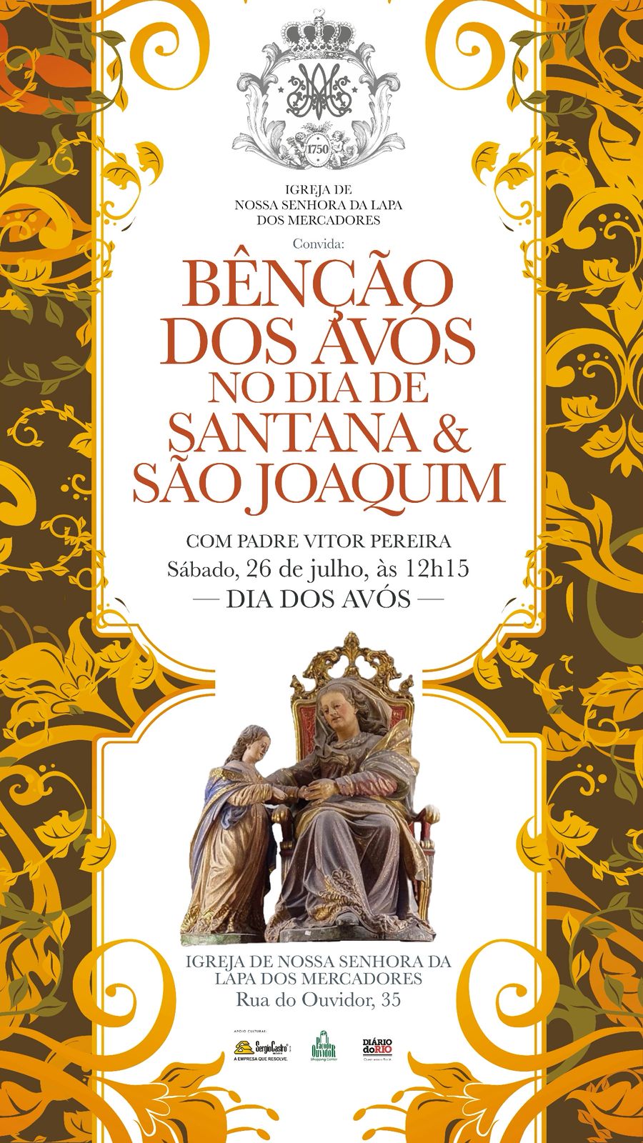 Provedor da Irmandade de Nossa Senhora da Lapa dos Mercadores, Claudio André Castro convida para a Benção dos Avós, que acontecerá no dia de Santana e de São Joaquim , neste sábado, dia 26 de julho, às 12h15, na celebração da Missa Solene, pelo Padre Vitor Pereira, na igrejinha da rua do Ouvidor 35.