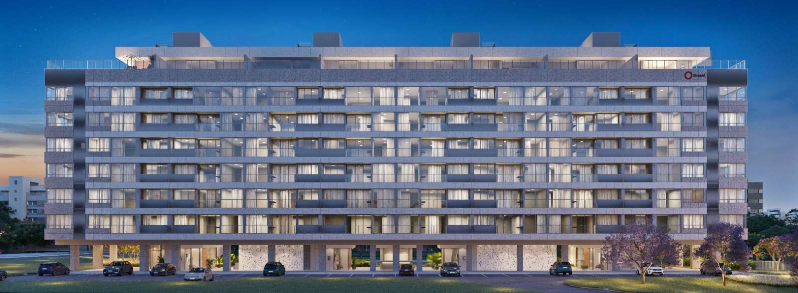 A fachada atemporal combina grandes planos de vidro com granito branco e cinza, marcando a horizontalidade da edificação. Nos espaços de lazer, distribuídos no pilotis e nas coberturas sociais, o projeto reúne academia, piscinas adulto e infantil, sauna, espaço gourmet, churrasqueira, salão de festas, brinquedoteca, área pet e vagas para carregamento de veículos elétricos.