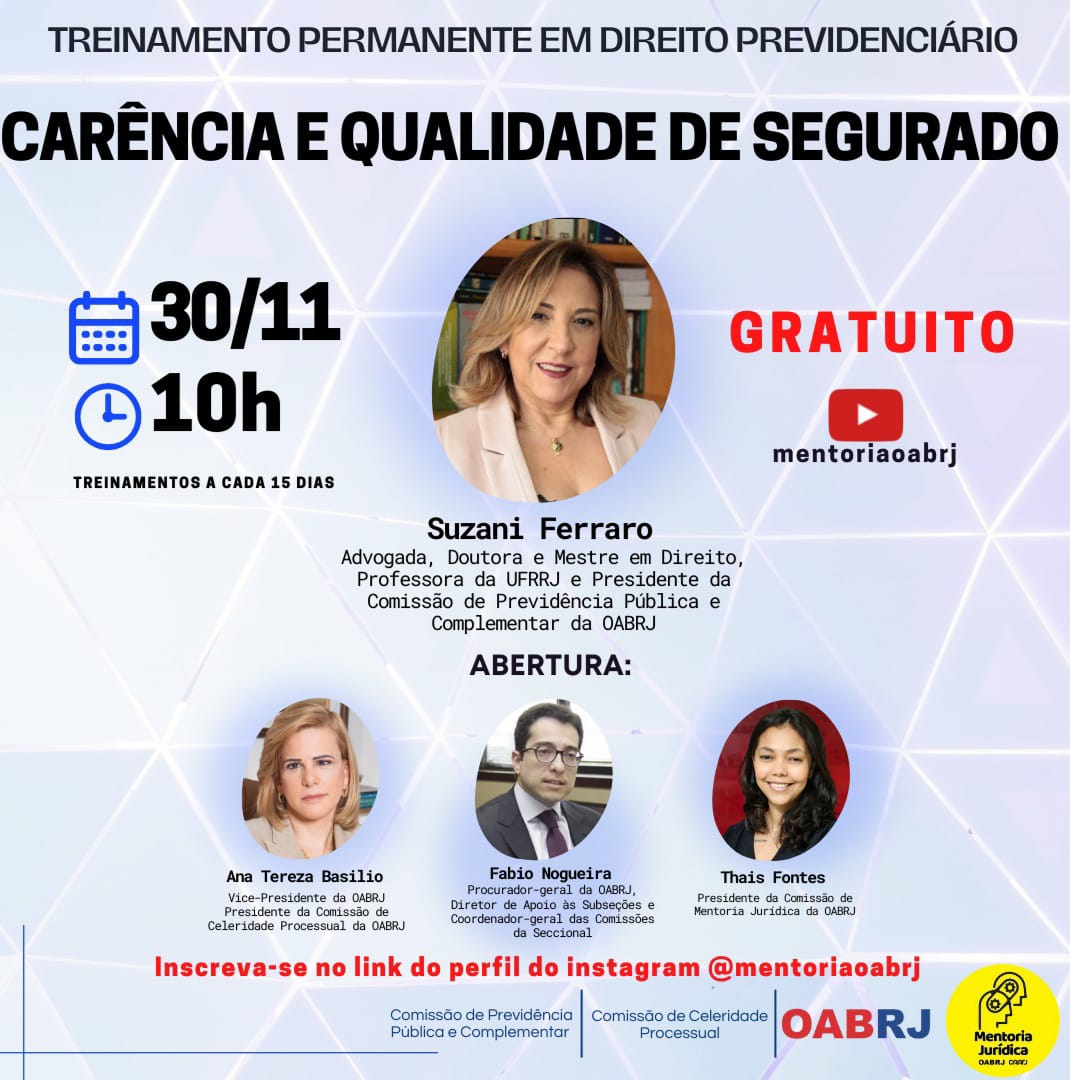 Vice-presidente da OAB-RJ e presidente da comissão de celeridade processual, Ana Tereza Basílio participa nesta quarta-feira, 30, às 10h, pelo YouTube mentoriaoabrj, do Treinamento Permanente em Direito Previdenciário, “Carência e Qualidade do Segurado”.
