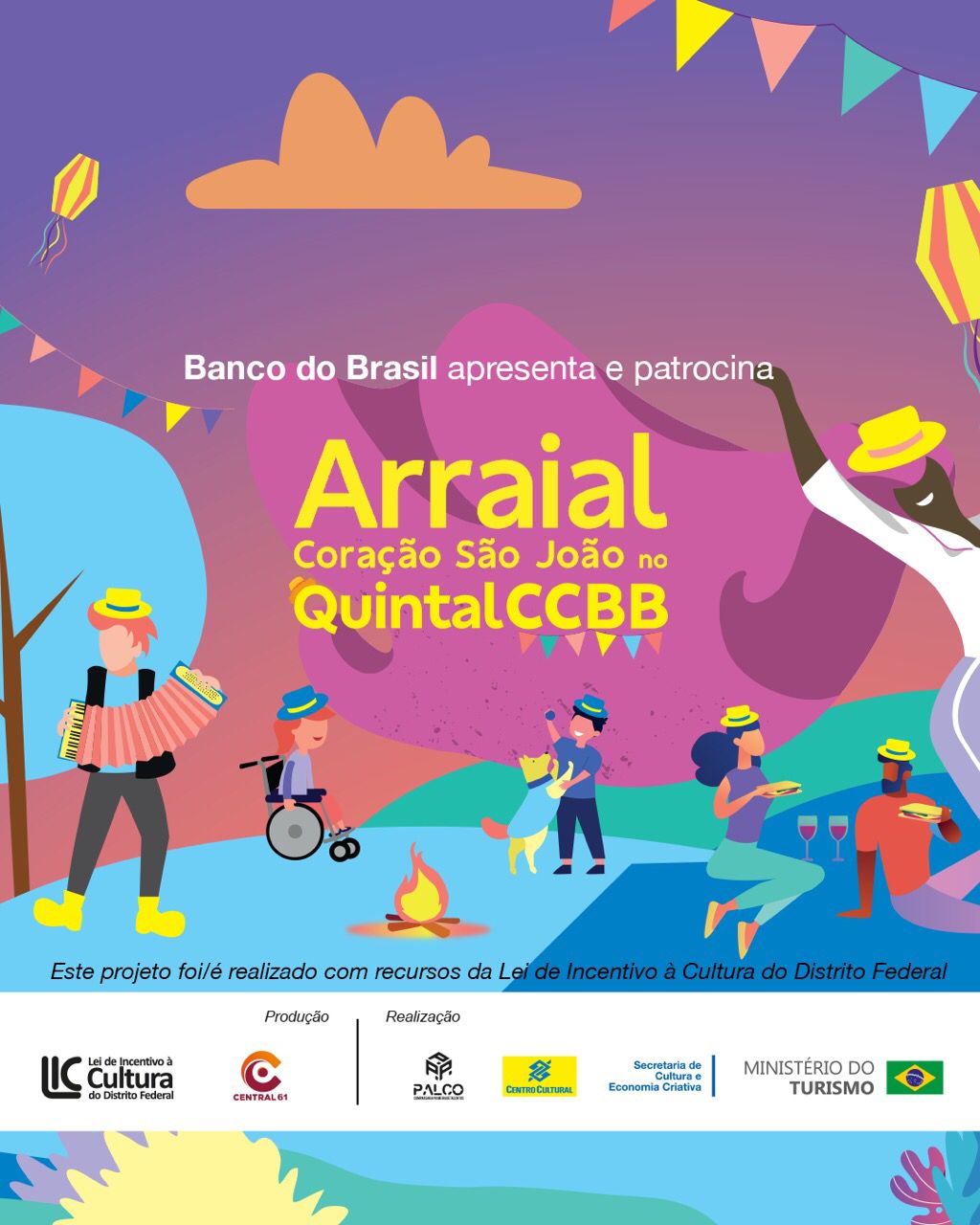 E com essas cores, ritmos e pluralidade, o Quintal do Centro Cultural Banco do Brasil Brasília será transformado em um grande e festivo Arraial Julino nos dias 30 e 31 de julho, sábado e domingo, a partir do meio-dia. O Arraial, com fomento da Secretaria de Estado de Cultura e Economia Criativa do DF, via LIC – Lei de Incentivo à Cultura do DF, tem entrada franca mediante a doação de 1Kg de alimento.