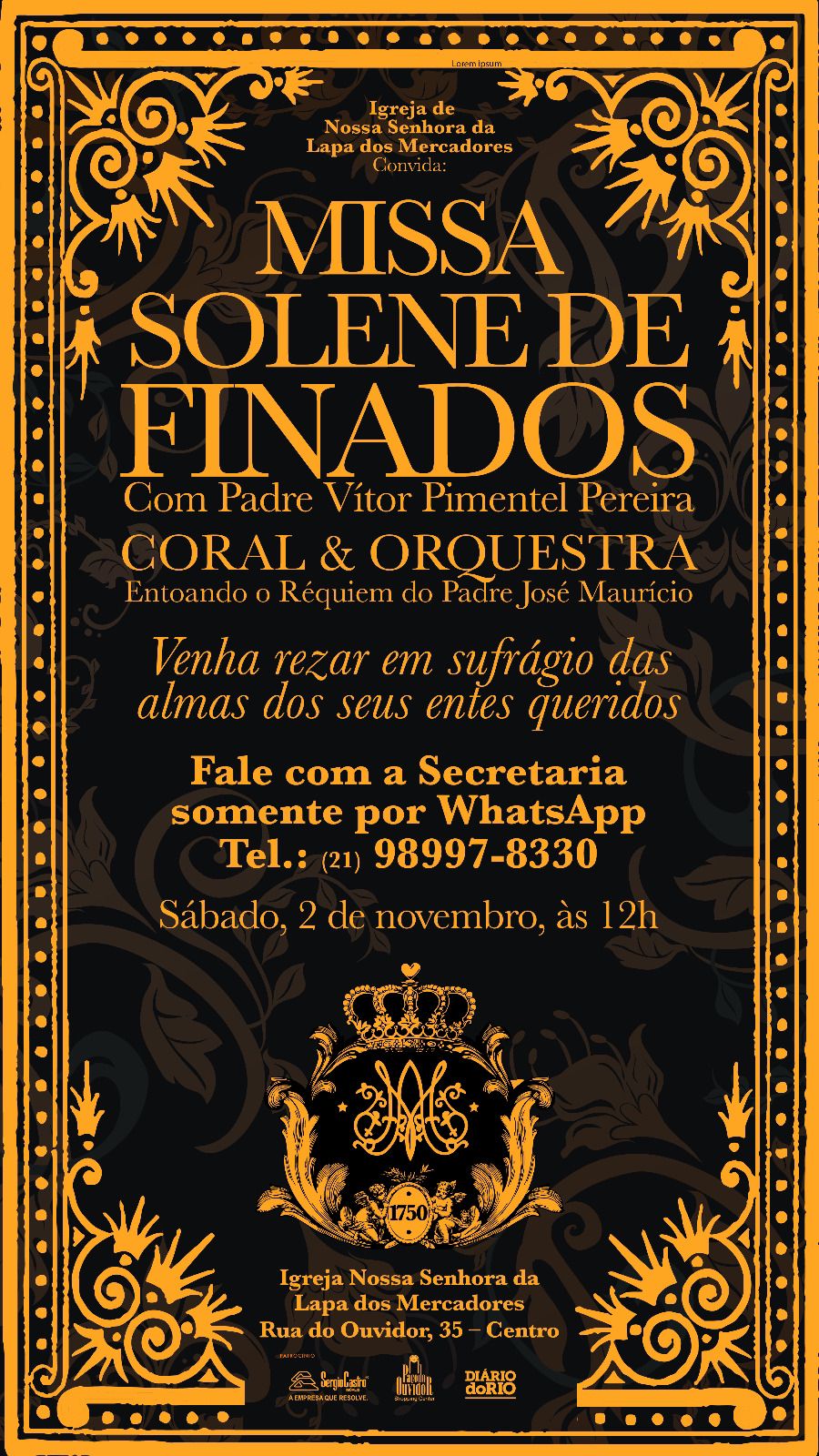 Provedor da Irmandade de Nossa Senhora da Lapa dos Mercadores,  Claudio André Castro convida para a Missa Solene de Finados,  que será celebrada pelo padre Vitor Pimentel Pereira, neste sábado,  dia 2 de novembro, às 12h, com Coral e Orquestra, entoando o Requiém do padre José Maurício, na igrejinha da rua do Ouvidor 35, no Centro do Rio de Janeiro.