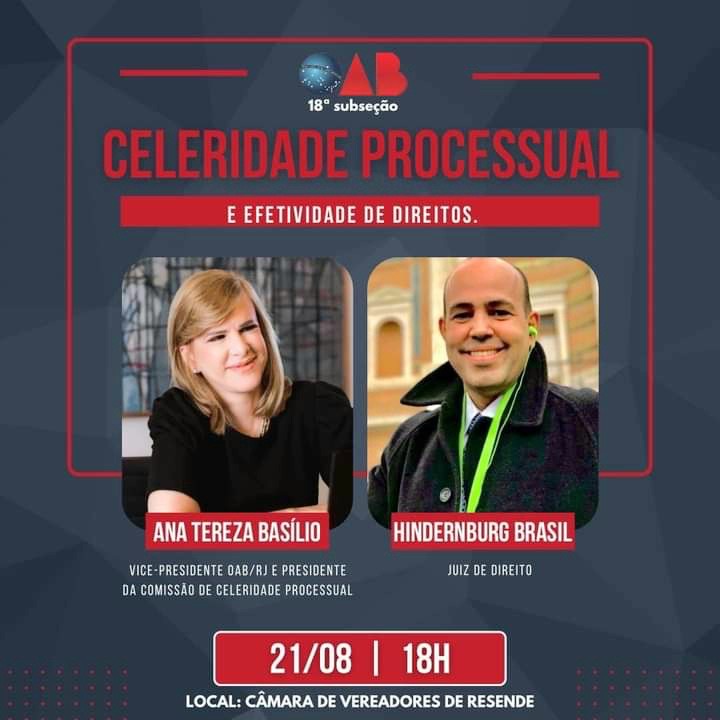 Vice-presidente da OAB-RJ e presidente da comissão de celeridade processual, Ana Tereza Basílio dará palestra sobre ” Celeridade Processual e Efetividade dos Direitos “, junto com o juiz de Direito, Hindernburg Brasil, nesta quinta, dia 21 de agosto, às 18h, na Câmara dos Vereadores de Resende.