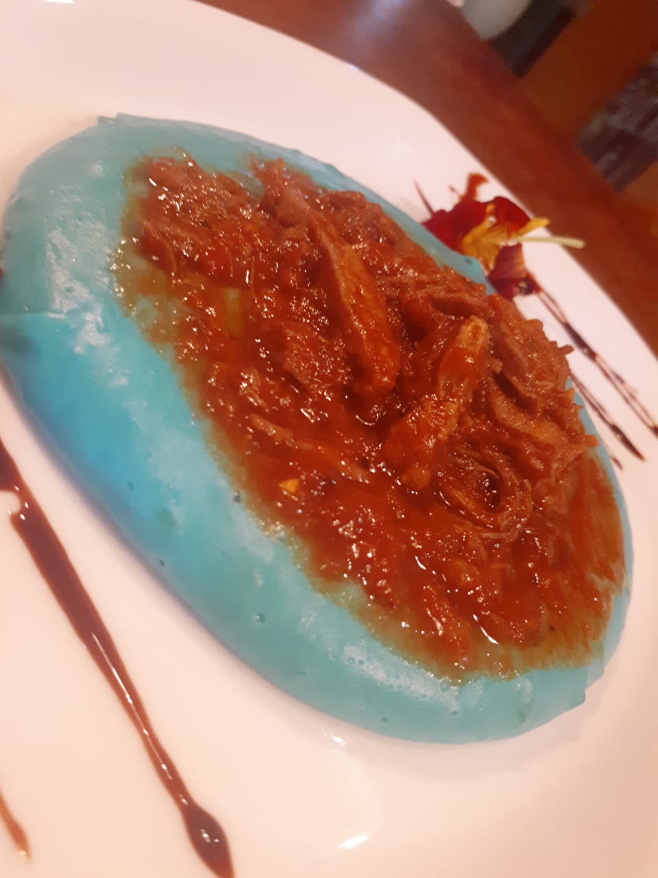 Faça um purê de mandioca e acrescente creme de leite e queijo e mexa até dar a liga do Aligot. Acrescente duas gotas de corante comestível azul e misture.