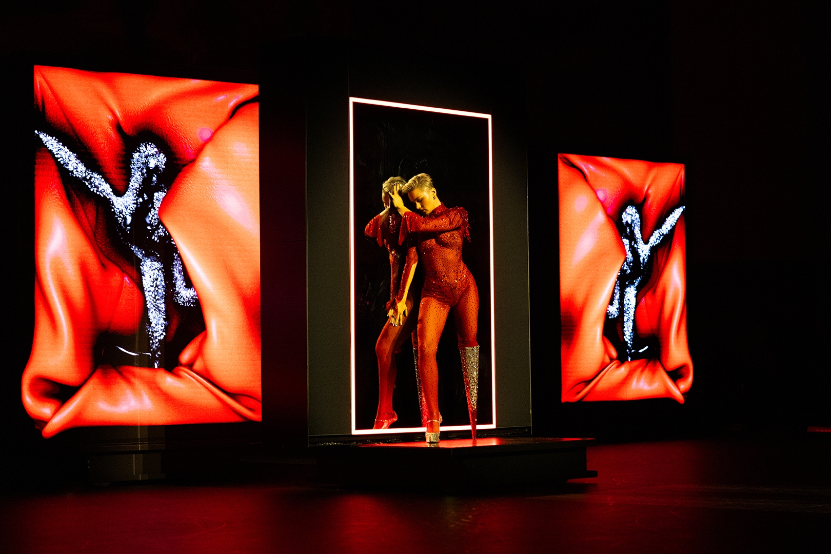 Ao lado de Viktoria, dezesseis intérpretes interpretam um estilo de dança contemporânea que amplifica os movimentos do corpo. Ao longo de sua performance, os dançarinos são justapostos a telas em movimento criadas pela Aumovis, uma empresa líder alemã em paredes de LED autônomas, com as telas seguindo a coreografia dirigida por Larbi e conduzida por um computador.