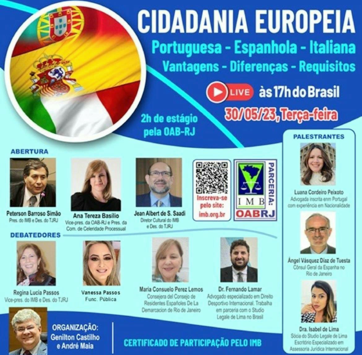 Vice-presidente da OAB-RJ e presidente da comissão de celeridade processual,  Ana Tereza Basilio vai participar, nesta terça-feira,  30, pelo canal YouTube,  da abertura do evento “Cidadania Europeia – Portuguesa,  Espanhola, Italiana. Vantagens,  Diferenças, Requisitos”.