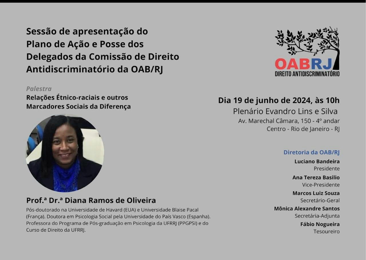 Na ocasião, acontecerá a palestra com o tema ” Relações Étnico-raciais e outros marcadores sociais da Diferença”, a ser proferida pela pós-doutora na Universidade de Harvard, professora Diana Ramos de Oliveira,do Programa de Pós- Graduação em Psicologia da UFRRJ e do Curso de Direito da UFRRJ.