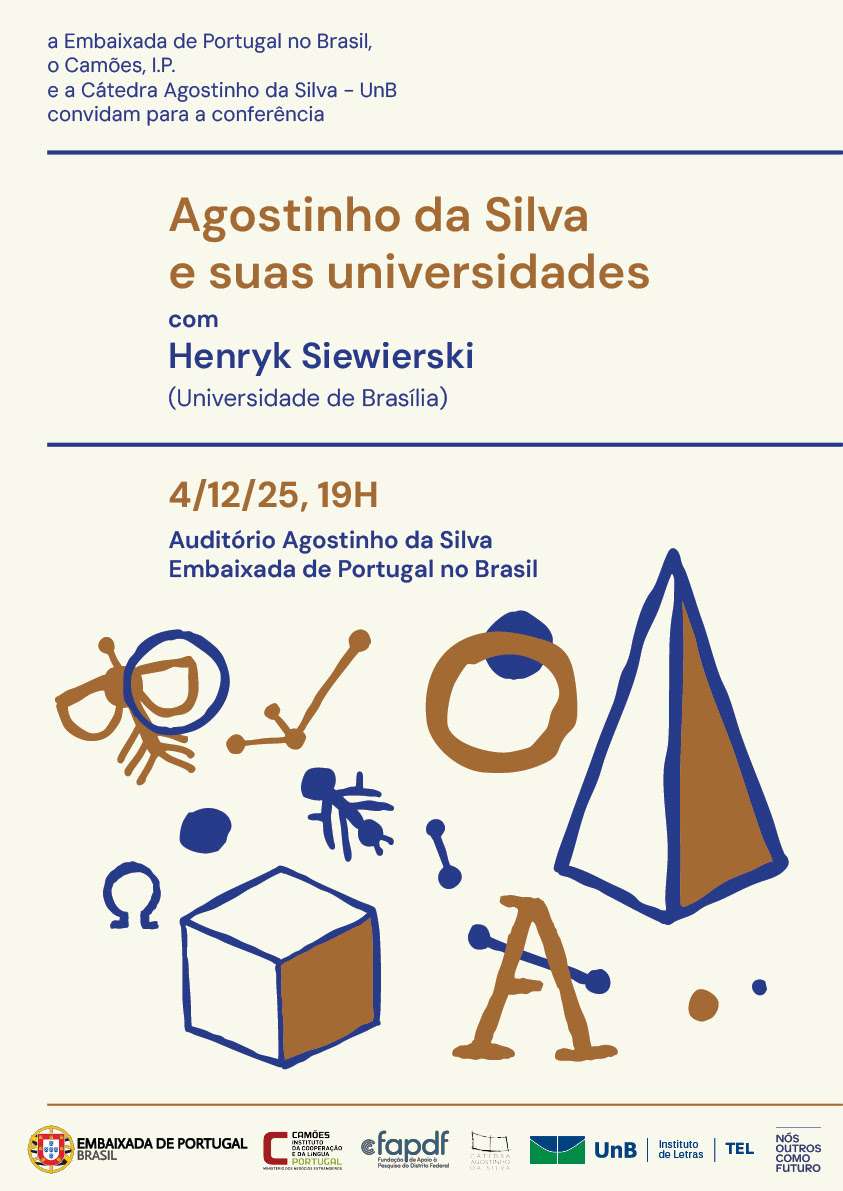 A sessão terá lugar no auditório que leva o nome do pensador – Agostinho da Silva – na Embaixada de Portugal no Brasil, às 19h do dia 4 de dezembro de 2025.
