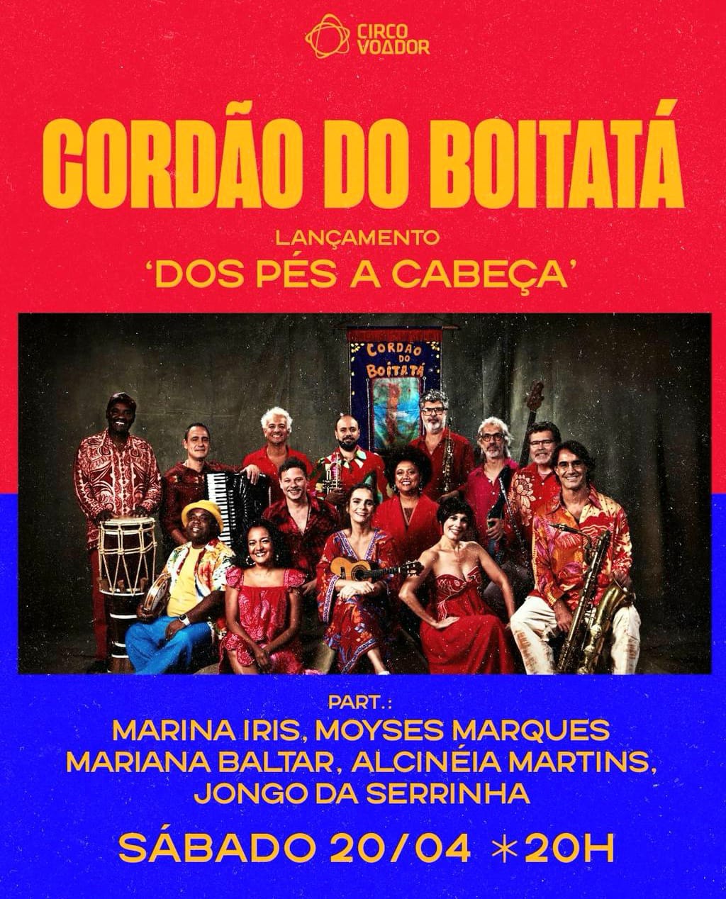 Mariana Baltar, Marina Iris, Moyses Marques, Alcinéia Martins e Jongo da Serrinha participam do Lançamento do Álbum Duplo ” Dos pés à cabeça “, do Cordão do Boitatá, com Baile show no Circo Voador, neste sábado, dia 20 de abril, às 20h.