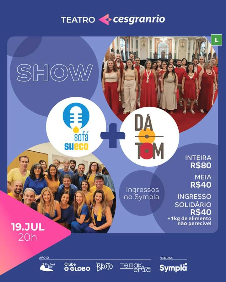 Criado por Carlos Alberto Serpa, o Teatro Cesgranrio ( Rua Santa Alexandrina número 1011, Rio Comprido) vai receber na próxima sexta-feira, dia 19 de julho, às 20h, o evento ” Dá o Tom +Sofá Sueco “, com apresentações de dois grupos regidos pelo maestro Dalton Coelho.