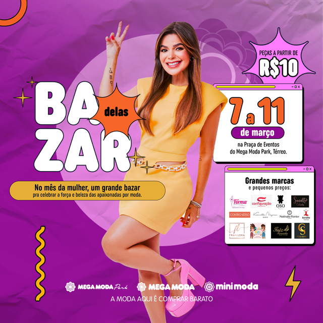 “O Bazar Delas acontece em comemoração ao Dia Internacional da Mulher, celebrado em 8 de março. Essa ação se consolidou e a movimentação tem sido muito positiva, tanto pelo volume de vendas quanto em relação à divulgação das marcas, já que o espaço se torna uma vitrine a mais para lojas”, afirma Tássia Carvalho, Gerente de Marketing do Mega Moda.