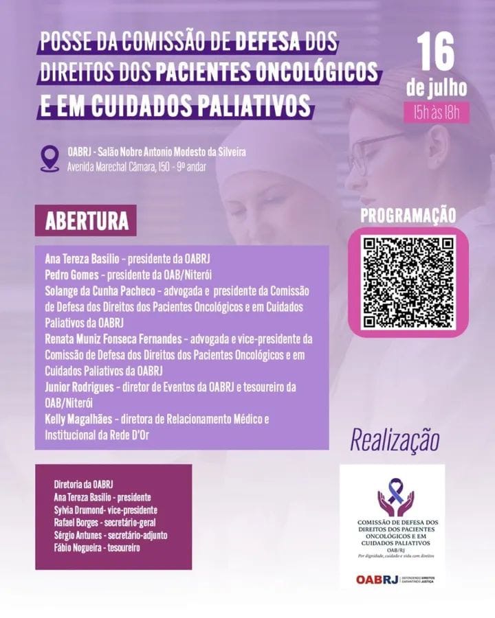 Também estarão no evento presencial, a presidente da comissão de Defesa dos Pacientes Oncológicos e em Cuidados Paliativos, da OAB-RJ, Solange da Cunha Pacheco, a vice-presidente da comissão, Renata Muniz Fonseca Fernandes, o presidente da OAB de Niterói, Pedro Gomes, o Diretor de Eventos e Tesoureiro da OAB de Niterói, Júnior Rodrigues, e a diretora de Relacionamento Médico e Institucional da Rede D’Or, Kelly Magalhães.