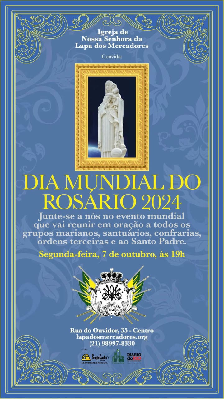 Provedor da Irmandade de Nossa Senhora da Lapa dos Mercadores,  o empresário Claudio André Castro,  diretor da Sergio Castro Imóveis e presidente do Conselho de Renovação do Centro do Rio, da Associação Comercial,  convida para a oração pelo Dia Mundial do Rosário,  na próxima segunda-feira,  dia 7 de outubro,  às 19h,  na igrejinha da rua do Ouvidor número 35.