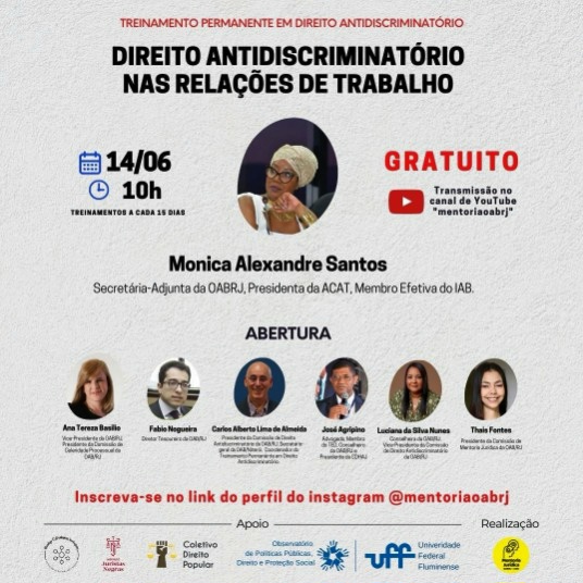 Também estarão no encontro virtual, a secretária-adjunta da OAB-RJ, Mônica Alexandre, o Diretor Tesoureiro, Fabio Nogueira, a presidente da comissão de Mentoria Jurídica, Thaís Fontes, o presidente da comissão de Direito Antidiscriminatório, Carlos Alberto Lima de Almeida, o presidente da CDHAJ, José Agripino, e a vice-presidente da comissão de Direito Antidiscriminatório, Luciana da Silva Nunes.
