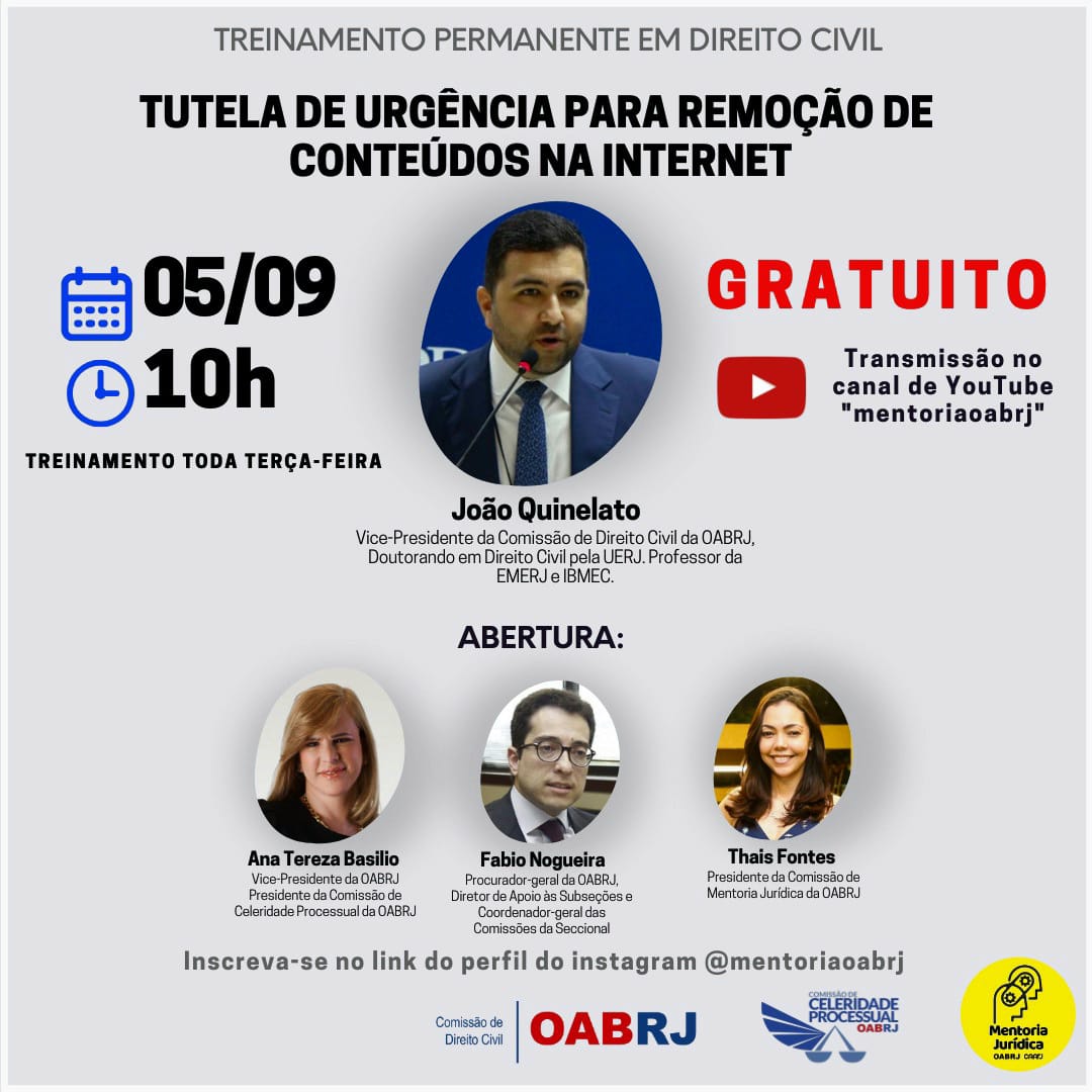 Também estarão no encontro virtual e gratuito, o advogado João Quinelato, o procurador-geral da OAB-RJ, Fábio Nogueira, e a presidente da comissão de Mentoria Jurídica, Thais Fontes.
