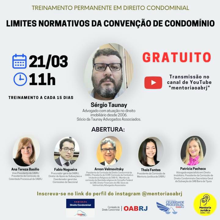 Também estarão no encontro virtual, o procurador-geral da OAB-RJ, Fabio Nogueira, o presidente da comissão de Direito Condominial, Arnon Velmobitsky, a presidente da comissão de Mentoria Jurídica da seccional, Thais Fontes, e as advogadas Patrícia Pacheco e Sérgio Taunay.