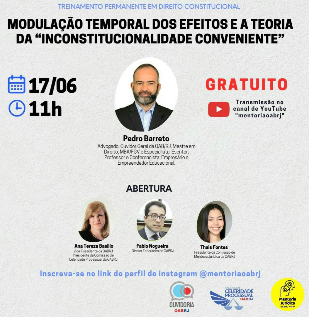 Também estarão no encontro virtual, o Diretor Tesoureiro da OAB-RJ, Fabio Nogueira, a presidente da comissão de Mentoria Jurídica, Thaís Fontes, e o Ouvidor Geral da seccional e advogado Pedro Barreto.