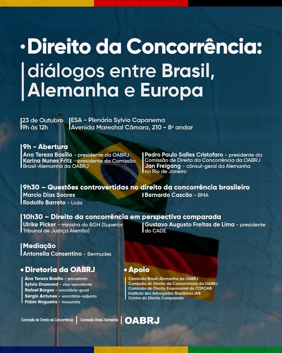 Também estarão na mesa de abertura do encontro presencial,  a presidente da comissão Brasil-Alemanha da OAB-RJ, Karina Nunes Fritz,  o presidente da comissão de Direito da Concorrência da seccional,  Pedro Paulo Salles Cristofaro,  e o cônsul-geral da Alemanha, Jan Freigang.