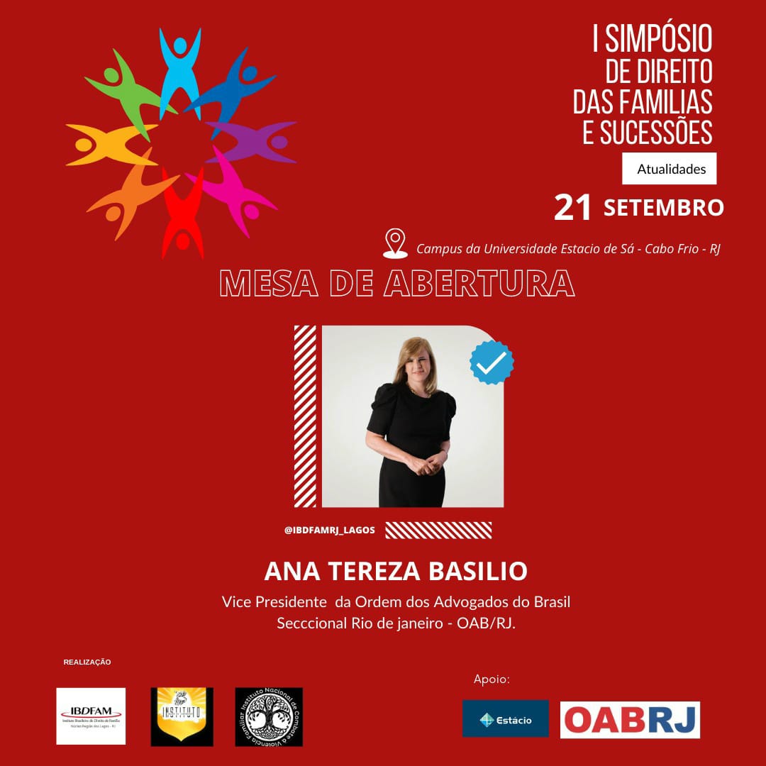 Vice-presidente da OAB-RJ e presidente da comissão de celeridade processual, Ana Tereza Basilio vai participar, nesta quinta-feira, 21 de setembro, às 9h, na Universidade Estácio de Sá de Cabo Frio, da mesa de abertura do I Simpósio de Direito das Famílias e Sucessões – Atualidades.