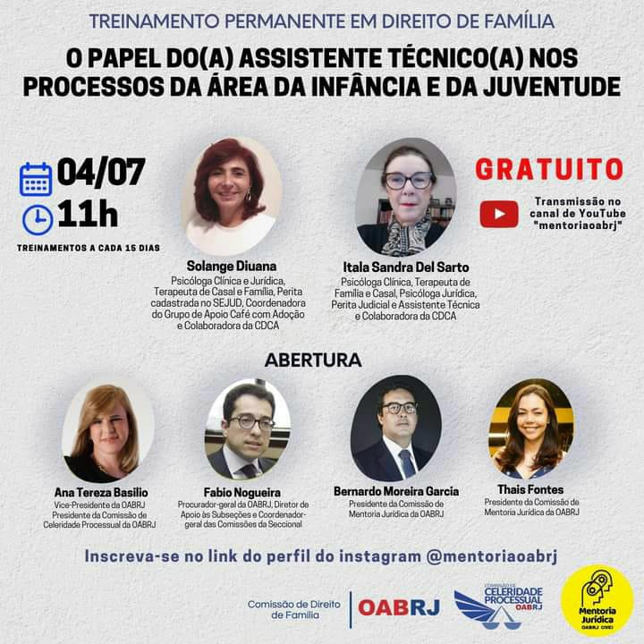 Vice-presidente da OAB-RJ e presidente da comissão de celeridade processual, Ana Tereza Basilio vai participar, nesta terça-feira, dia 4, às 11h, pelo canal YouTube mentoriaoabrj, do Treinamento Permanente em Direito de Família, com o tema “O papel do ( a) assistente técnico nos processos da área da infância e da juventude”.