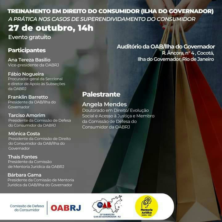 Também estarão no encontro gratuito e presencial, o procurador-geral, Fábio Nogueira, a presidente da comissão de Mentoria Jurídica, Thais Fontes, o presidente da OAB da Ilha do Governador, Franklin Barreto, o presidente da comissão de Direito do Consumidor, Tarciso Amorim, e os advogados Monica Costa, Barbara Gama e Angela Mendes.