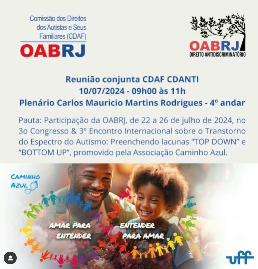 Vice-presidente da OAB-RJ e presidente da comissão de celeridade processual, Ana Tereza Basílio fará a palestra de abertura, na próxima quarta-feira, dia 10 de julho, às 11h, no Plenário Carlos Maurício Martins Rodrigues, na sede da OAB-RJ, da reunião conjunta promovida pela comissão dos Direitos dos Autistas e seus Familiares (CDAF) e pela comissão de Direito Antidiscriminatório (CDANTI) da seccional para tratar 3° Congresso & 3° ENC Internacional sobre o Transtorno do Espectro do Autismo, que acontecerá entre os dias 22 e 26 de julho, no Reserva Cultural e no Campus UFF Gragoatá, com coordenação da Associação Caminho Azul.