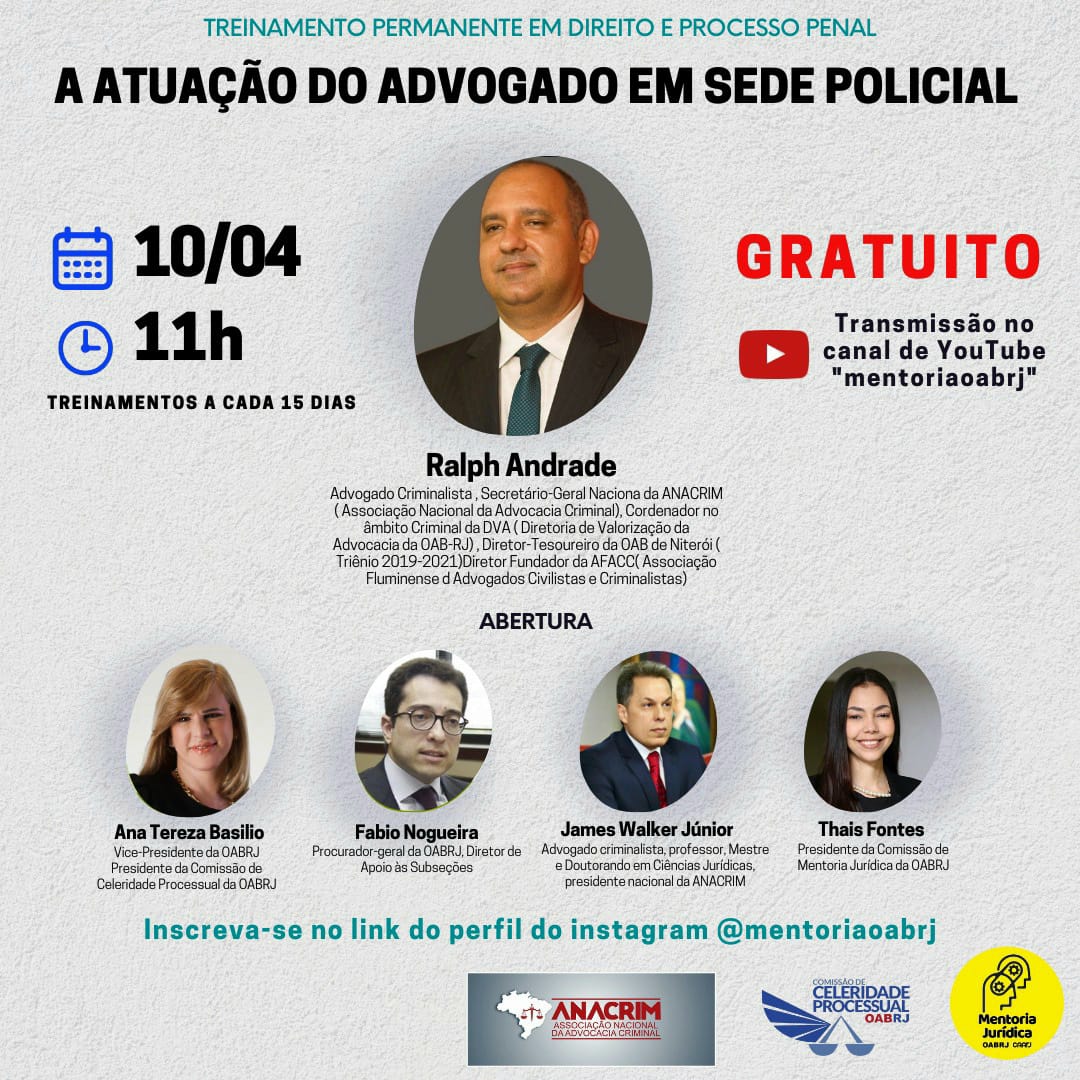 Também estarão no encontro virtual, o procurador-geral da OAB-RJ, Fabio Nogueira, a presidente da comissão de Mentoria Jurídica, Thais Fontes, o presidente nacional da Anacrim, James Walker Júnior, e o advogado criminalista Ralph Andrade.