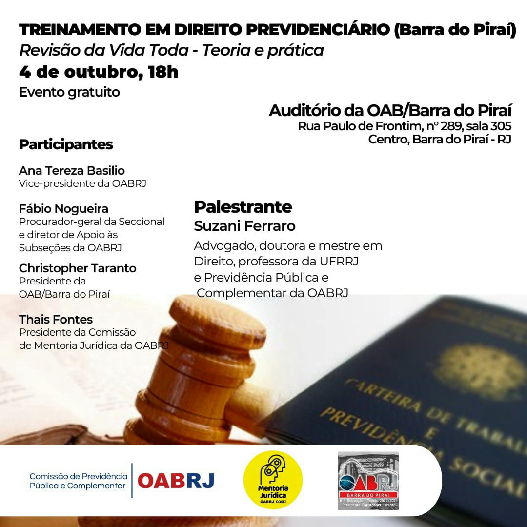Vice-presidente da OAB-RJ e presidente da comissão de celeridade processual, Ana Tereza Basilio vai participar, nesta quarta-feira, dia 4 de outubro, às 18h, do Treinamento Permanente em Direito Previdenciário, com o tema “Revisão da vida toda-Teoria e Prática”, no auditório da OAB de Barra do Piraí.