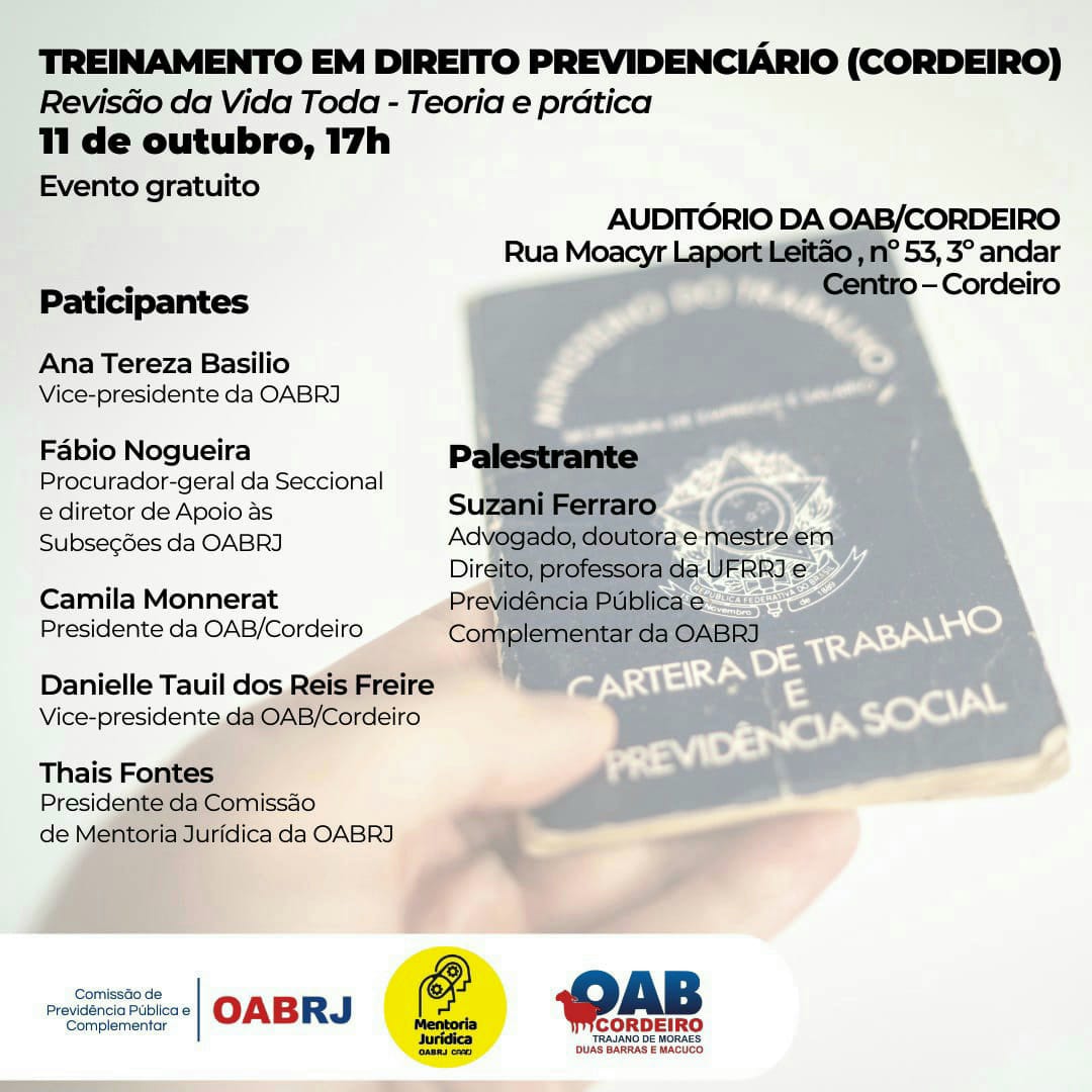 Vice-presidente da OAB-RJ e presidente da comissão de celeridade processual, Ana Tereza Basilio vai participar, nesta quarta, dia 11 de outubro, às 17h, do Treinamento Permanente em Direito Previdenciário, no auditório da OAB de Cordeiro, com o tema ” Revisão da vida toda-teoria e prática ” .