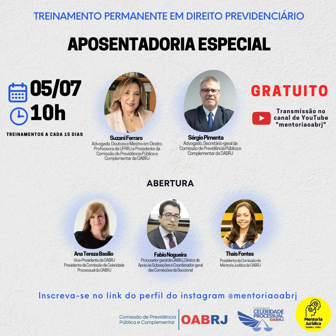 Vice-presidente da OAB-RJ e presidente da comissão de celeridade processual, Ana Tereza Basilio vai participar, nesta quarta-feira, 5 de julho, às 10h, do Treinamento Permanente em Direito Previdenciário, pelo canal YouTube mentoriaoabrj, com o tema “Aposentadoria Especial”.