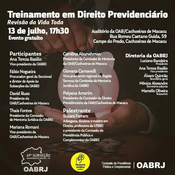 Vice-presidente da OAB-RJ e presidente da comissão de celeridade processual, Ana Tereza Basilio vai participar, nesta quinta-feira, dia 13 de julho, às 17h30, no auditório da OAB de Cachoeiras de Macacu, do Treinamento Permanente em Direito Previdenciário, com o tema “Revisão da vida toda”.