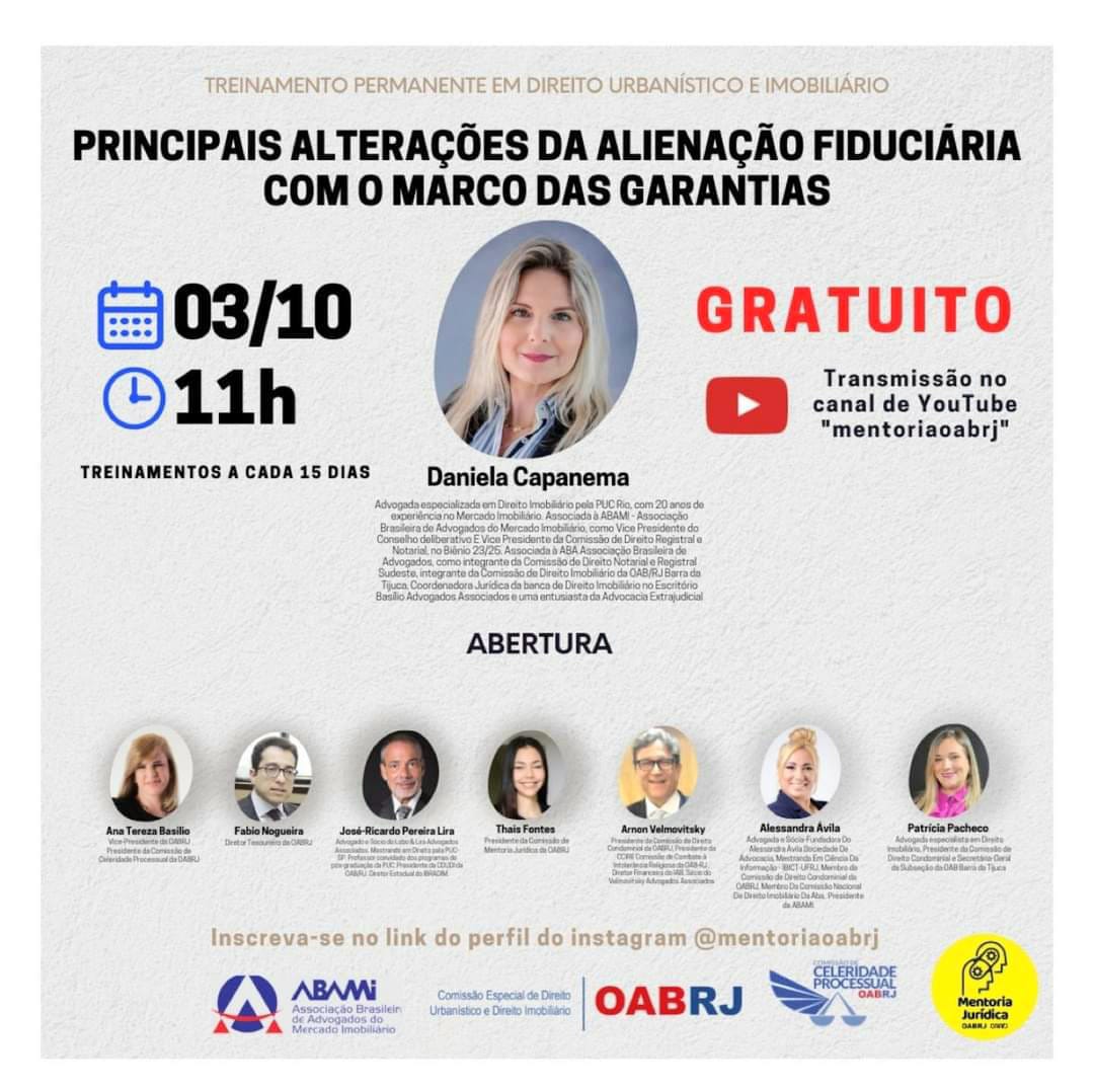 Vice-presidente da OAB-RJ e presidente da comissão de celeridade processual,  Ana Tereza Basílio vai proferir a palestra de abertura do Treinamento Permanente em Direito Urbanístico e Imobiliário,  nesta quinta,  dia 3 de outubro,  pelo canal YouTube mentoriaoabrj, com o tema ” Principais Alterações da Alienação Fiduciária,  com o marco das garantias “.