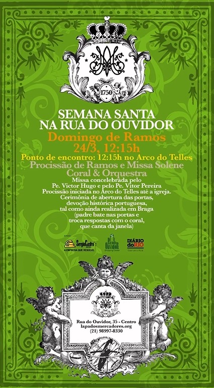 Provedor da Irmandade de Nossa Senhora da Lapa dos Mercadores e diretor da Sergio Castro Imóveis, Claudio André Castro convida para a Procissão de Ramos e Missa Solene, neste Domingo de Ramos, a partir das 12h15, na igrejinha da rua do Ouvidor número 35, com Coral e Grande Orquestra.