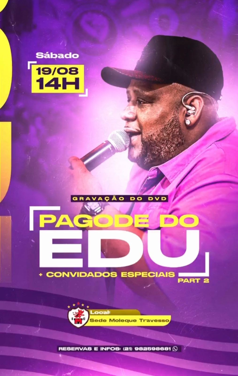 No dia 19/08 (sábado), a partir das 14h, acontece a gravação do “Pagode do Edu” – parte 2, com vários convidados especiais como: grupo Mé Maior, Henrique Santos (ex-Soweto), Grupo Façanha, Waguininho (ex-Negritude Jr.) e Grupo Samba do Povo. O evento será na Sede Moleque Travesso, localizada na zona sul de São Paulo.