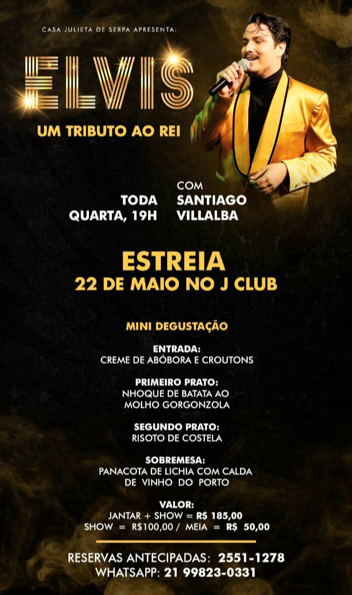 Dirigida por Beth Serpa e Carlos Alberto Serpa, a Casa Julieta de Serpa ( Praia do Flamengo número 340) oferece cardápio especial para o Jantar Musical que vai estrear, nesta quarta, dia 22 de maio, às 19h, no JCLUB ( Julieta Clube), com o título ” Elvis, Um Tributo ao Rei “.