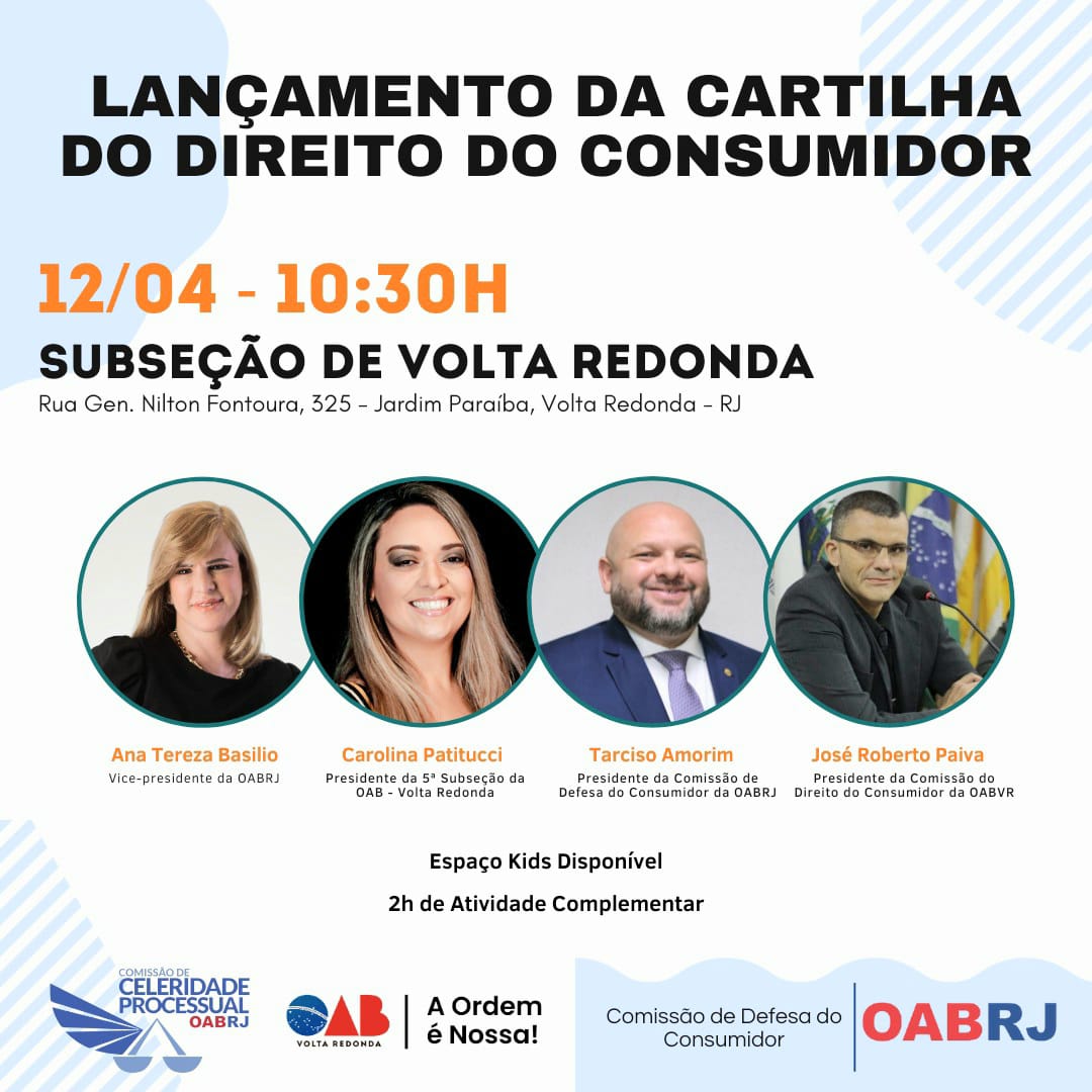 Também estarão no evento presencial, a presidente da OAB de Volta Redonda, Carolina Patitucci, o presidente da comissão de Defesa do Consumidor da OAB-RJ, Tarciso Amorim, e o presidente da comissão do Direito do Consumidor da OAB-RJ, José Roberto Paiva.