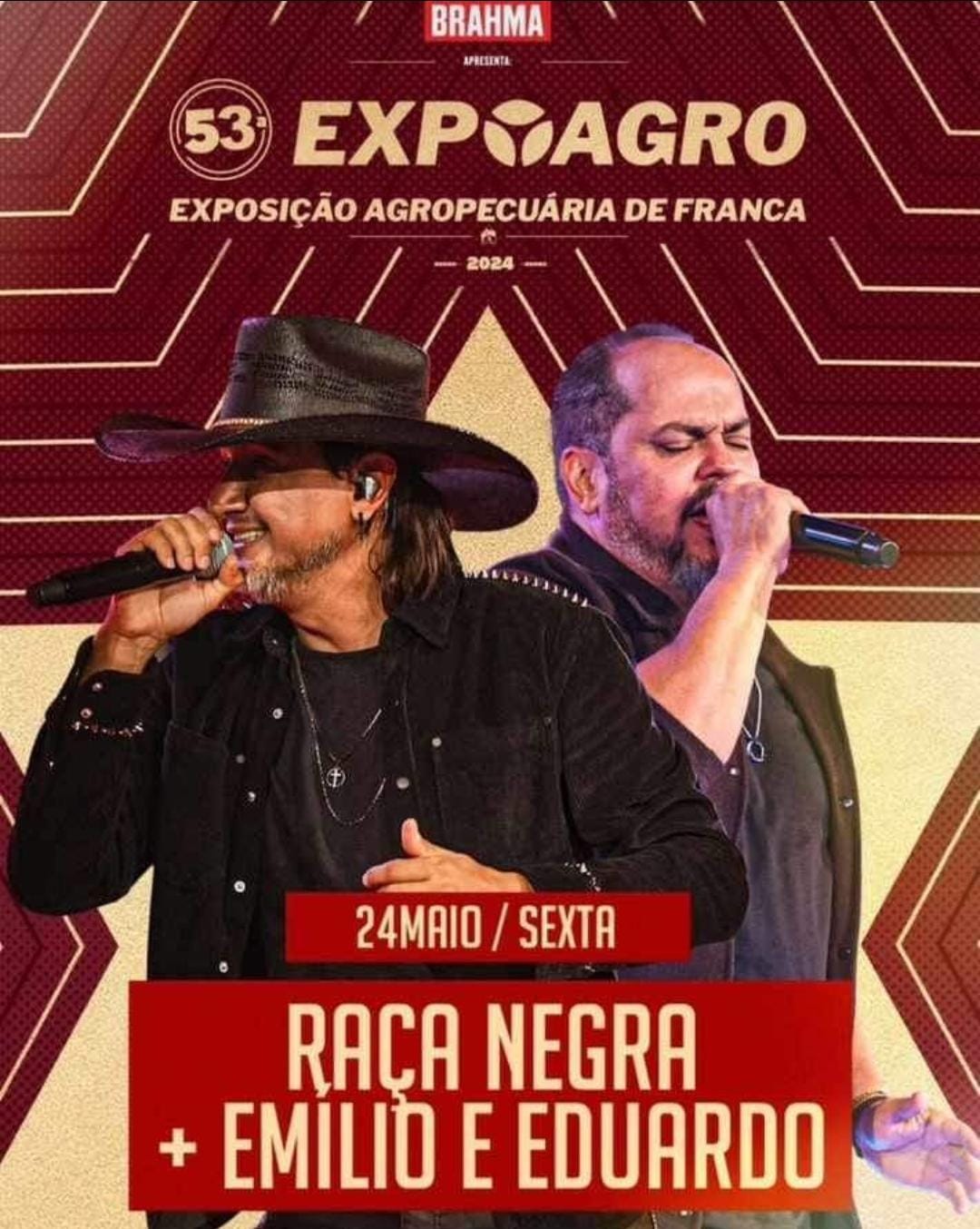 A dupla sertaneja Emilio e Eduardo está confirmada como uma das atrações principais da 53ª Expoagro de Franca, que é um dos eventos agropecuários mais tradicionais do Brasil, reunindo exposições de gado, leilões, provas equestres, e uma programação musical diversificada. O show, que promete agitar o público com grandes sucessos, será realizado no dia 24 de maio de 2024 (sexta-feira).